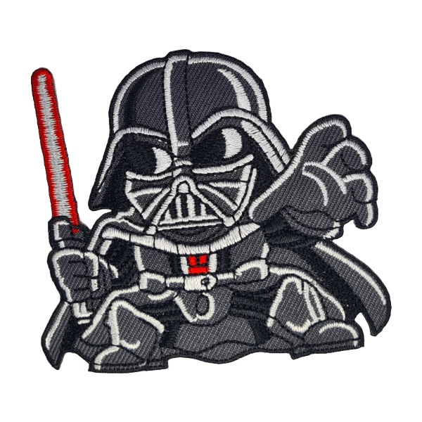 Cartoon Darth Vader Iron on Patch. This Star Wars applique is embroidered in black and white. The standing Darth Vader motif is holding a Lightsaber.