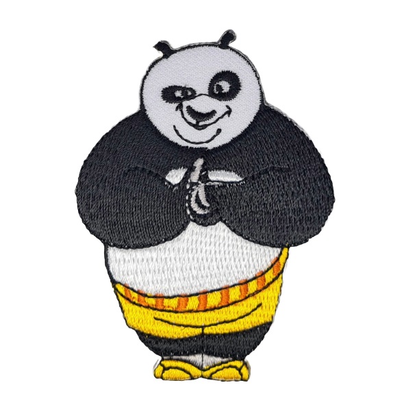 Kung Fu Panda Iron on Patch. This movie panda applique is embroidered in black and white. The standing panda motif is wearing golden pants and shoes.